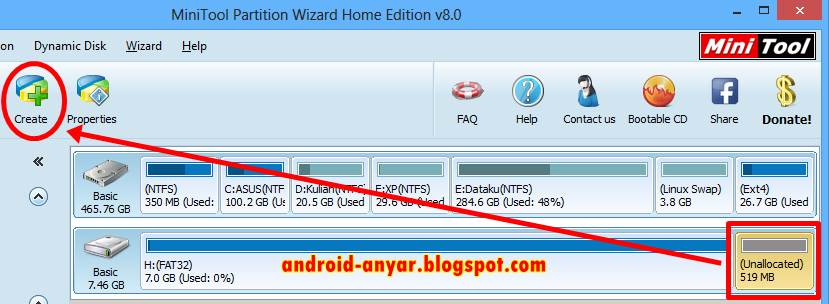 - Pilih/klik pada partisi baru (Unallocated) dengan ukuran sekitar 512 MB (pada gambar tertera 519MB). Lalu klik ‘Create‘ seperti pada langkah sebelumnya. Jika muncul peringatan, pilih saja OK/Yes. Perhatikan gambar!