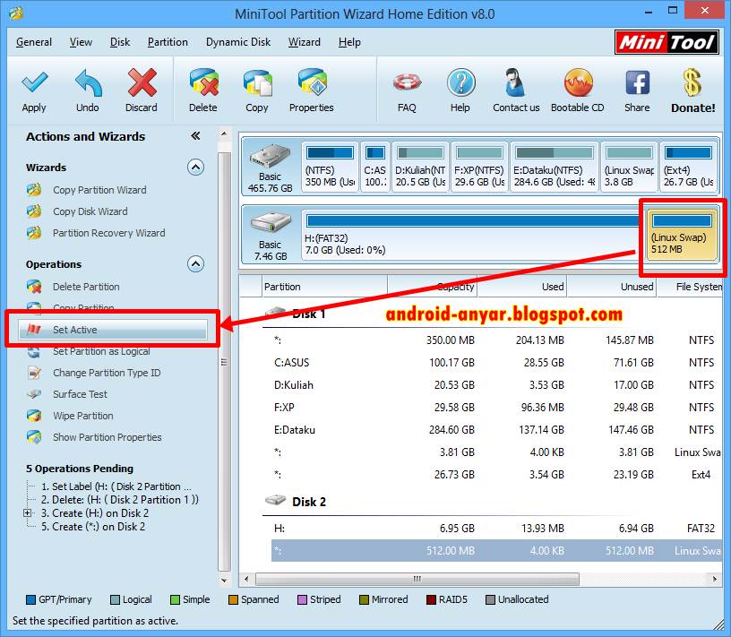 - Akan muncul nama ‘Linux Swap‘ pada partisi di SD card Anda. Untuk membuatnya dapat bekerja, aktifkan partisi tersebut dengan cara pilih ‘Set Aktive‘. Lihat gambar!